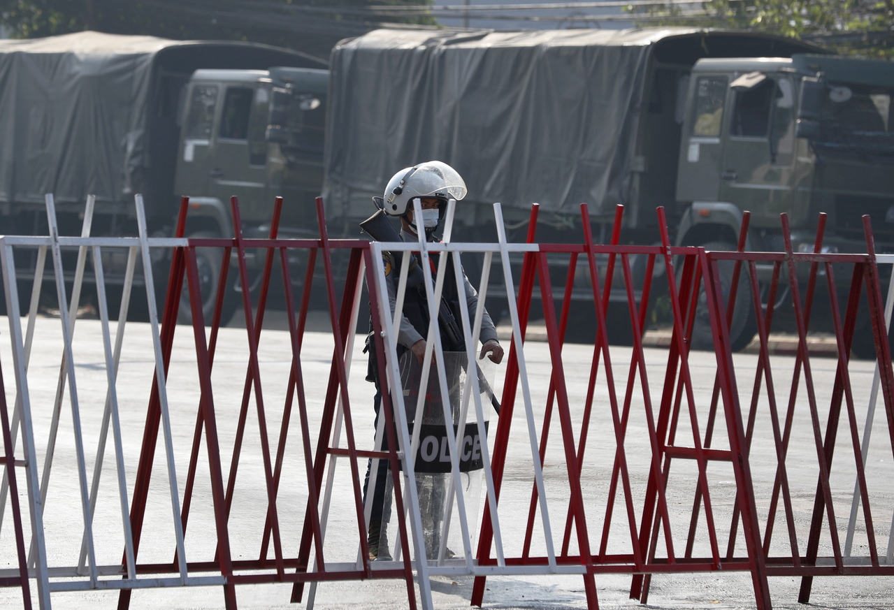 Riot police stand guard as they block a road in Yangon, on Feb 24, 2021.