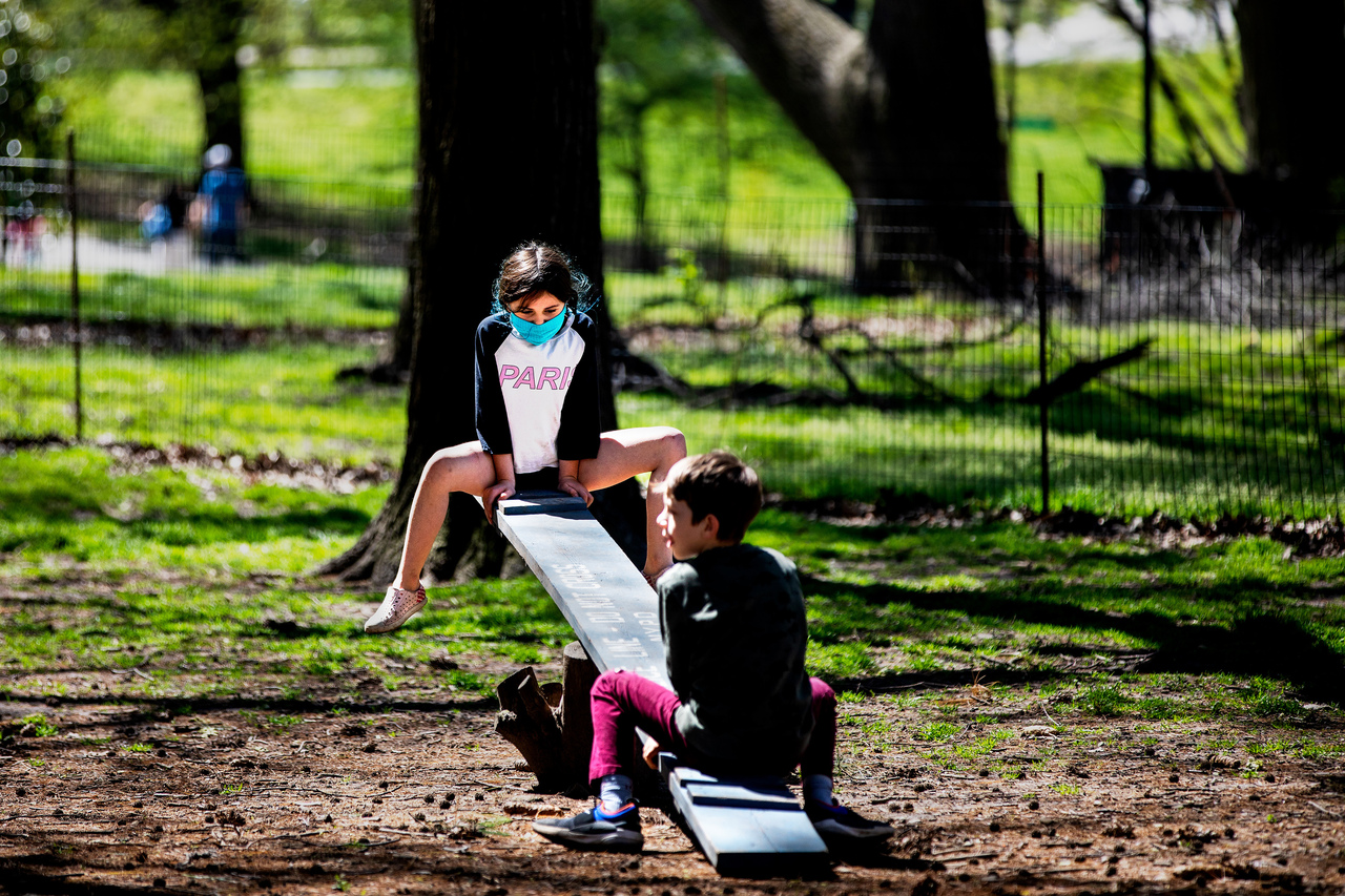 Children play on a makeshift see-saw at Prospect Park in Brooklyn on May 2, 2020.