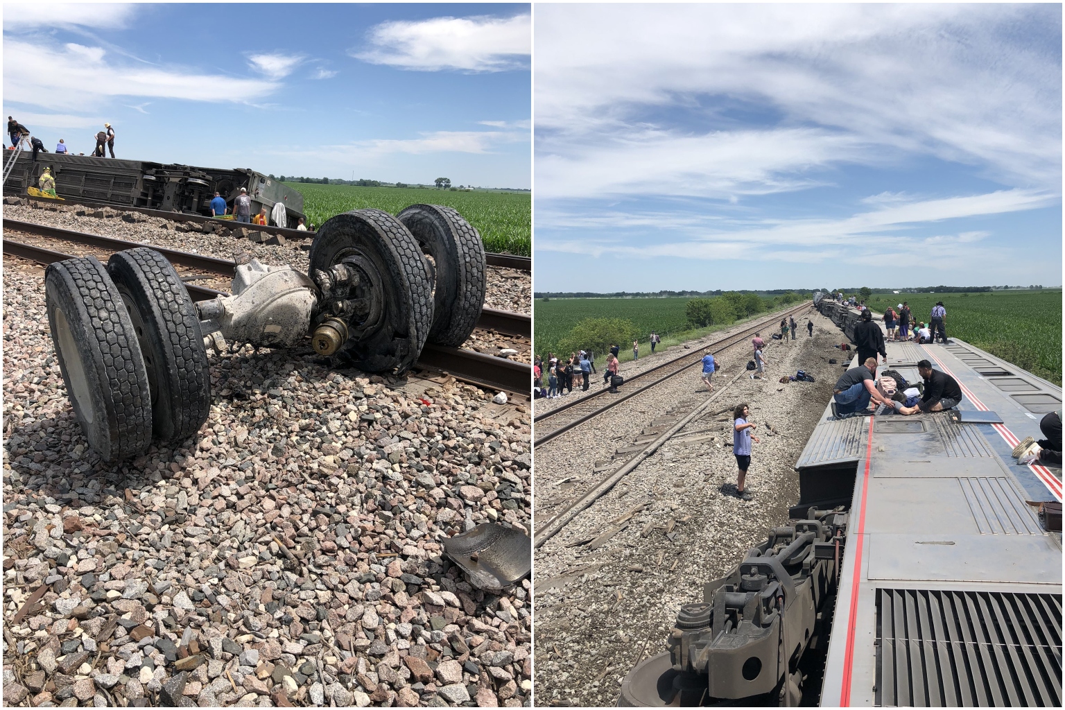 Seven of the Amtrak train's approximately eight cars derailed on a route from Los Angeles to Chicago when the train struck the truck at a rail crossing near Mendon, Missouri.