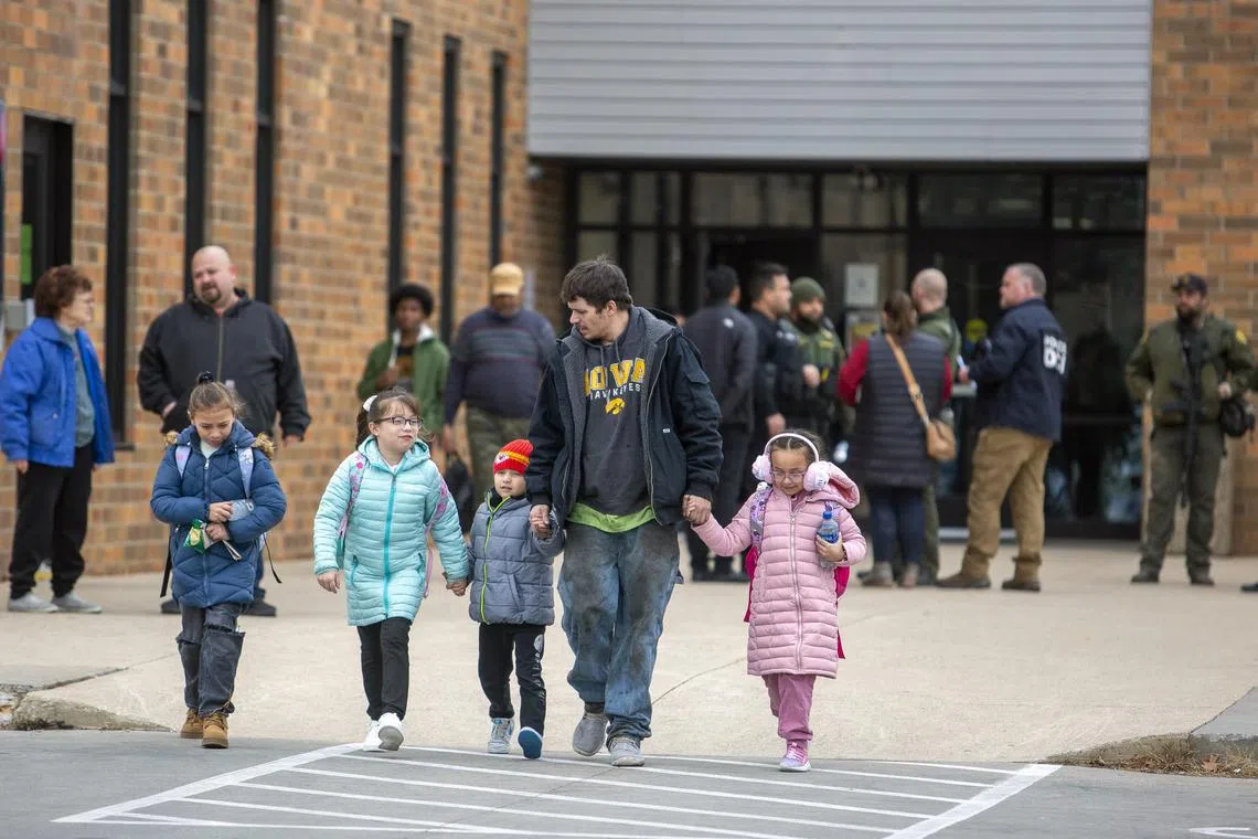 Children being led away from the Perry Middle School and High School in Perry, Iowa, after a shooting on Jan 4.