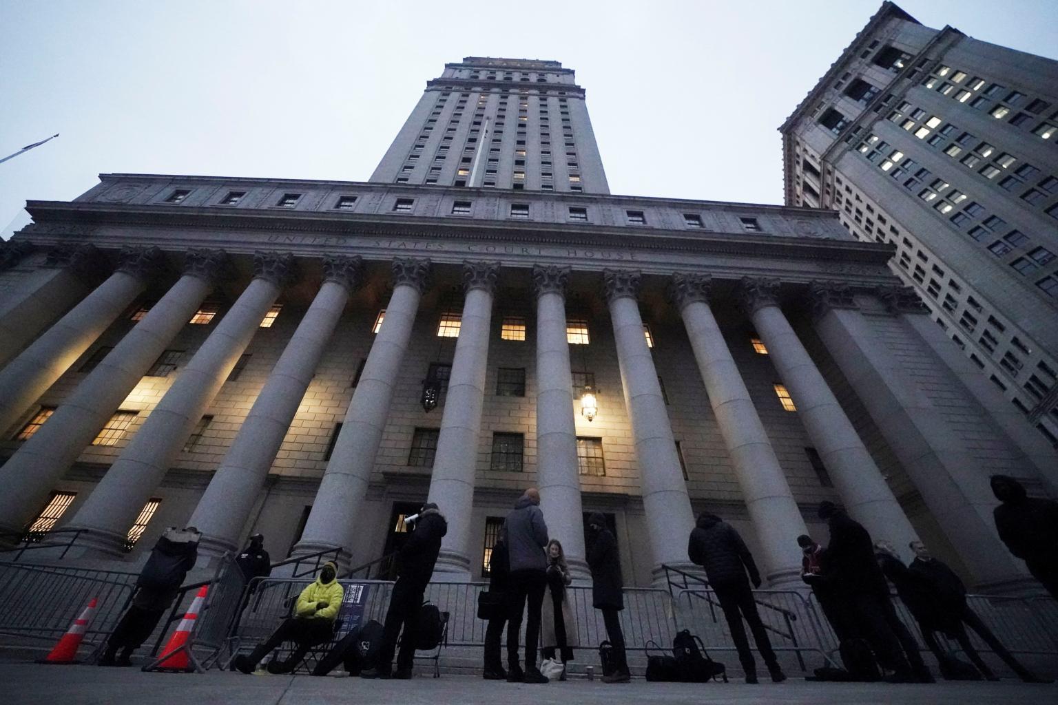 People wait to enter the court in Lower Manhattan for Ghislaine Maxwell's sex trafficking trial on Nov 30, 2021.