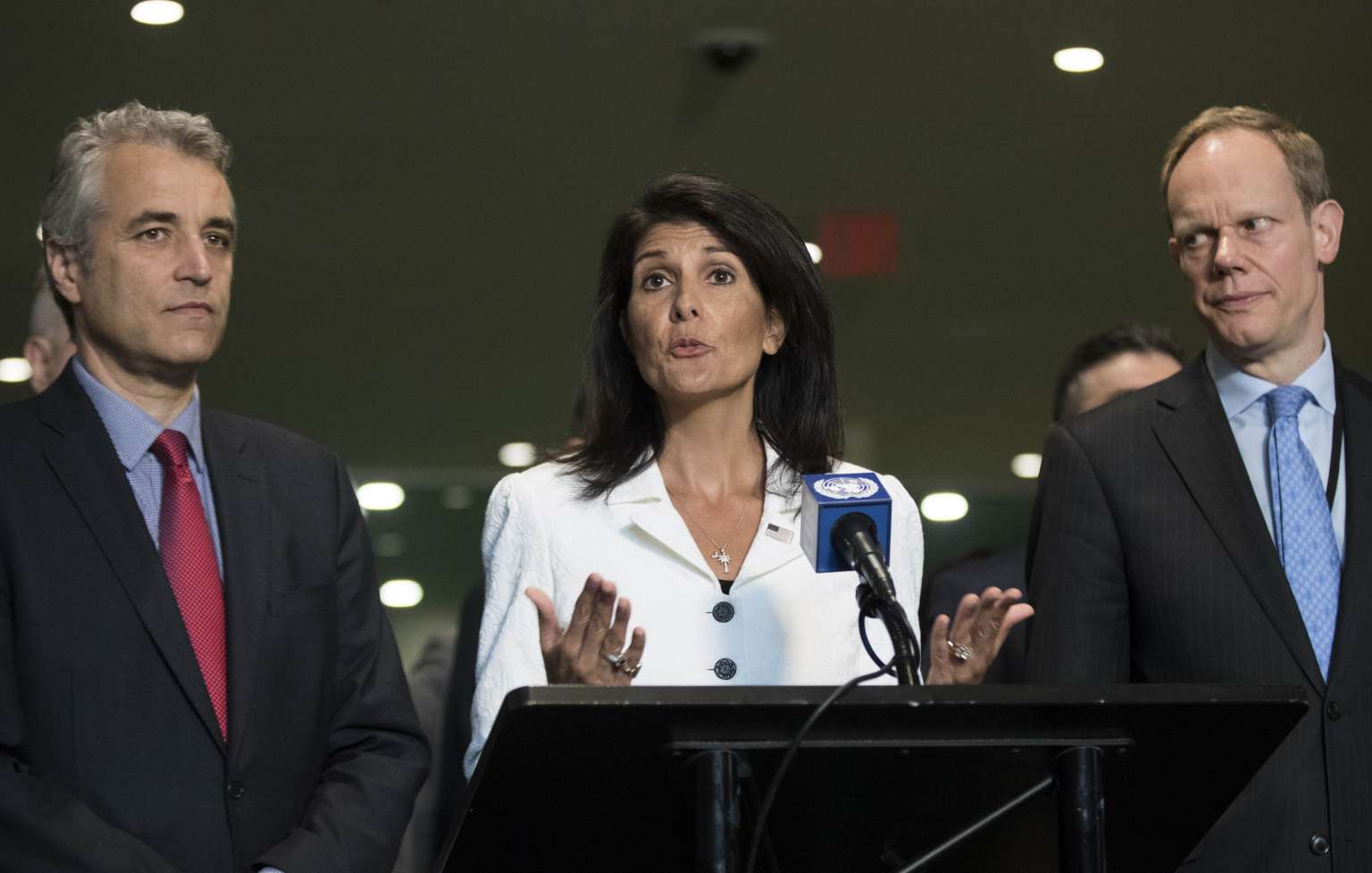 Flanked by French Deputy Representative to the UN Alexis Lamek (left) and Britain's Matthew Rycroft (right), Nikki Haley speaks to reporters at the UN headquarters.