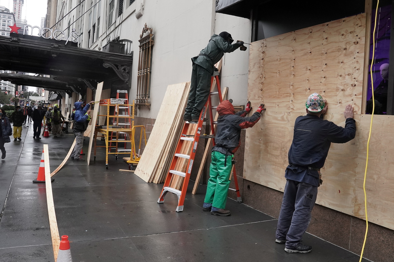 Workers board up the windows of a department store in preparation for the election in New York, on Oct 30, 2020.
