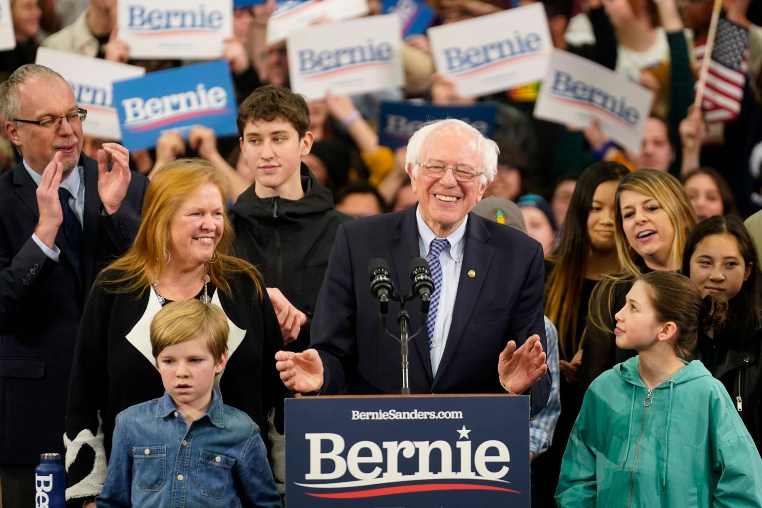 Democratic US presidential candidate Senator Bernie Sanders is accompanied by his wife Jane O’Meara Sanders and other relatives as he speaks at his New Hampshire primary night rally, on Feb 11, 2020.