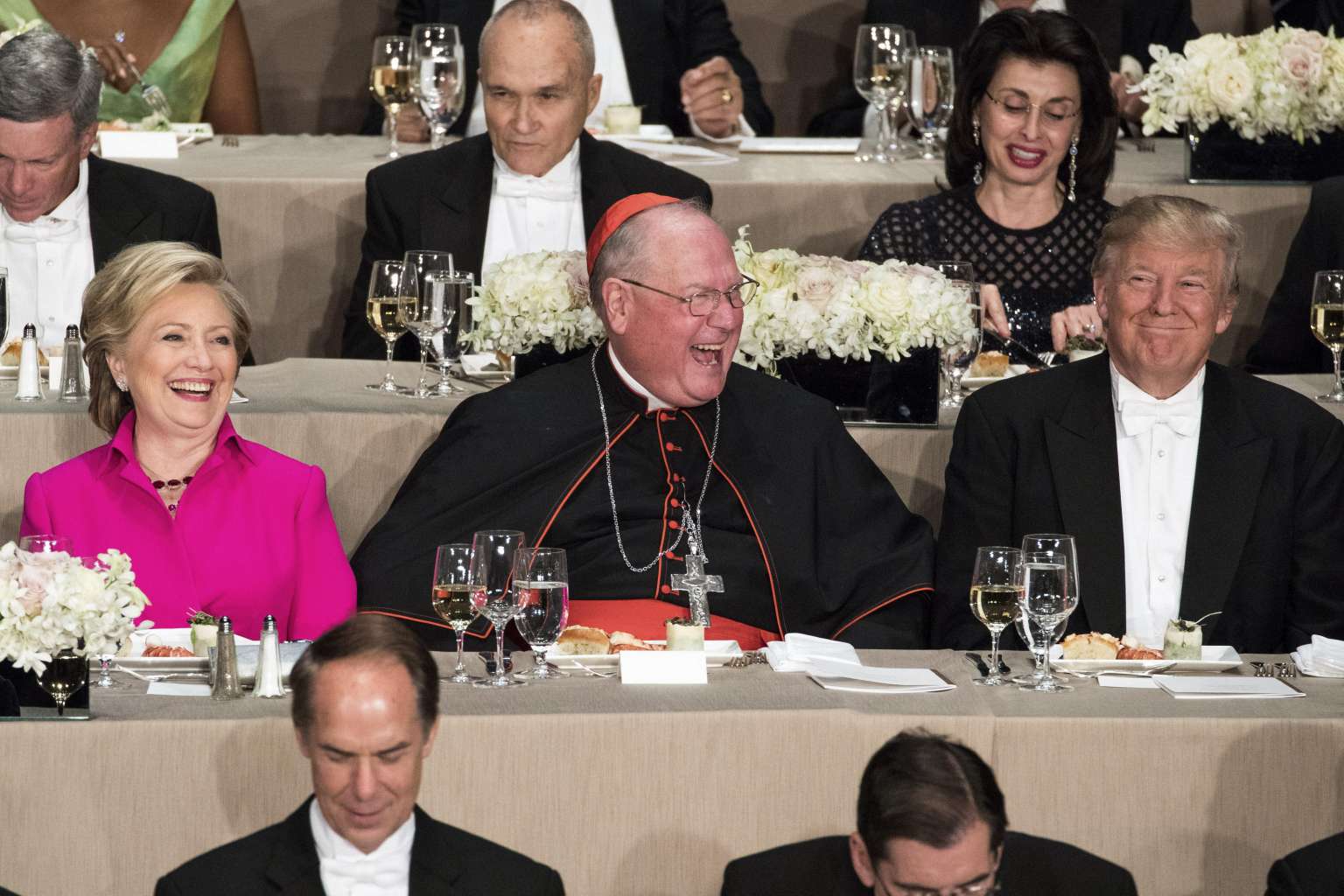 Hillary Clinton (left), Donald Trump (right) and Cardinal Timothy Dolan, the archbishop of New York attend the 71st annual Alfred E. Smith Memorial Foundation dinner.