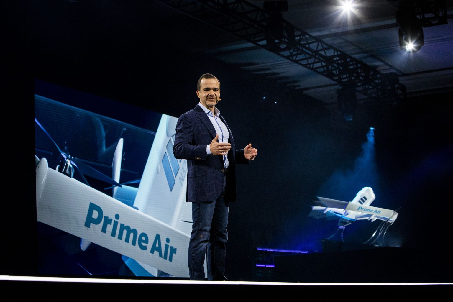 Jeff Wilke speaks next to a Prime Air delivery drone.