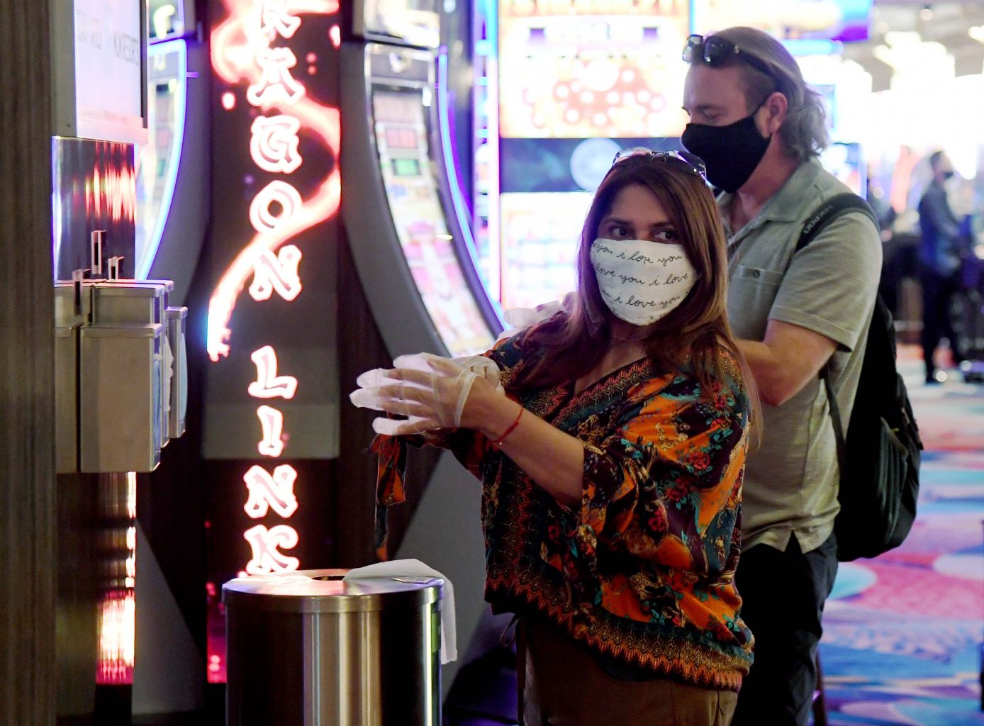 Guests take complimentary gloves from the side of a new hand-washing station at a casino in Las Vegas.