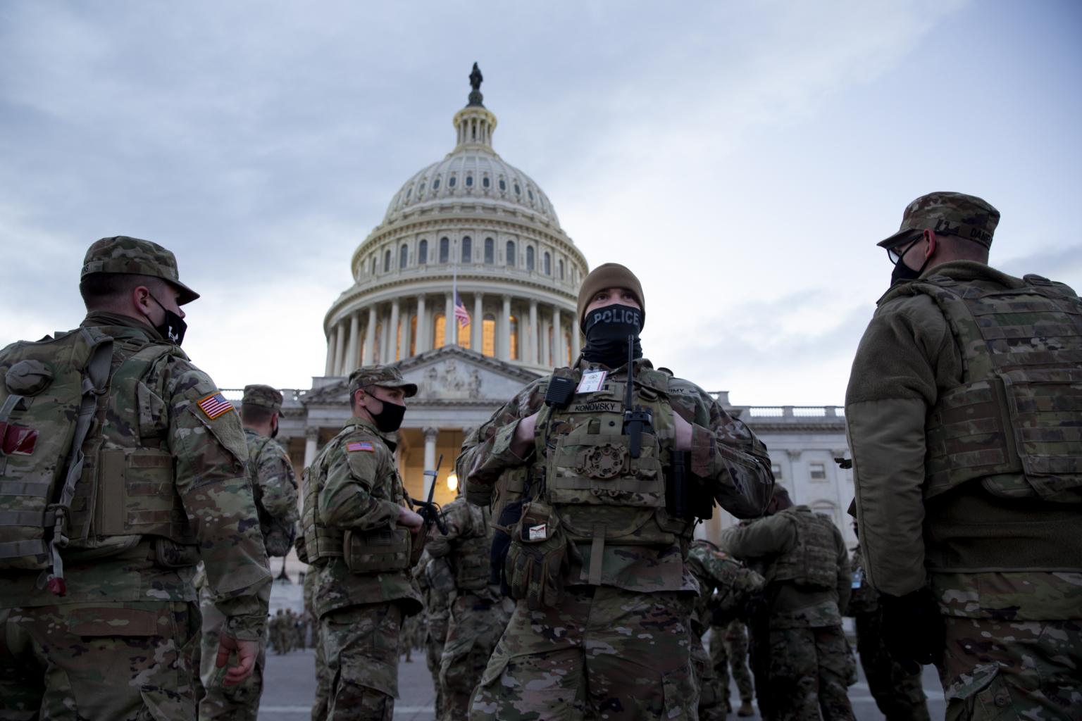 Members of the National Guard stand at the East Front of the US Capitol in Washington on Jan 18, 2021.