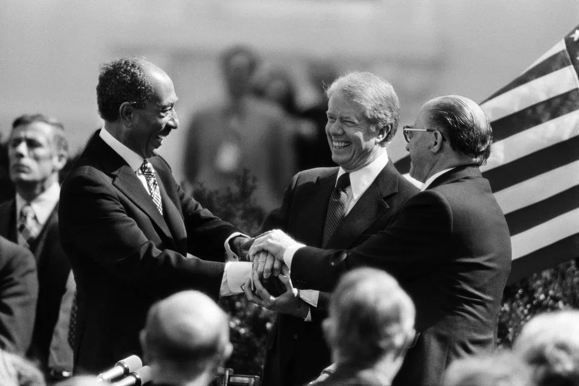 Then US President Jimmy Carter clasping hands with Egypt’s President Anwar Sadat after the signing of the Camp David Accords on March 26, 1979.