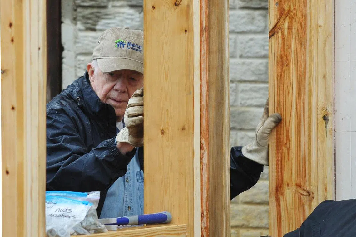Former US president Jimmy Carter helping to erect a frame during a Habitat for Humanity project in 2010.