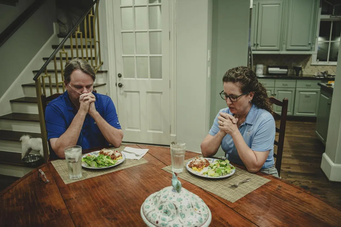 Mr Tom Kennedy, who was hospitalised with Covid-19 in November 2020 for about 80 days, prays with his wife, Gayle, before dinner in their home in Houston.