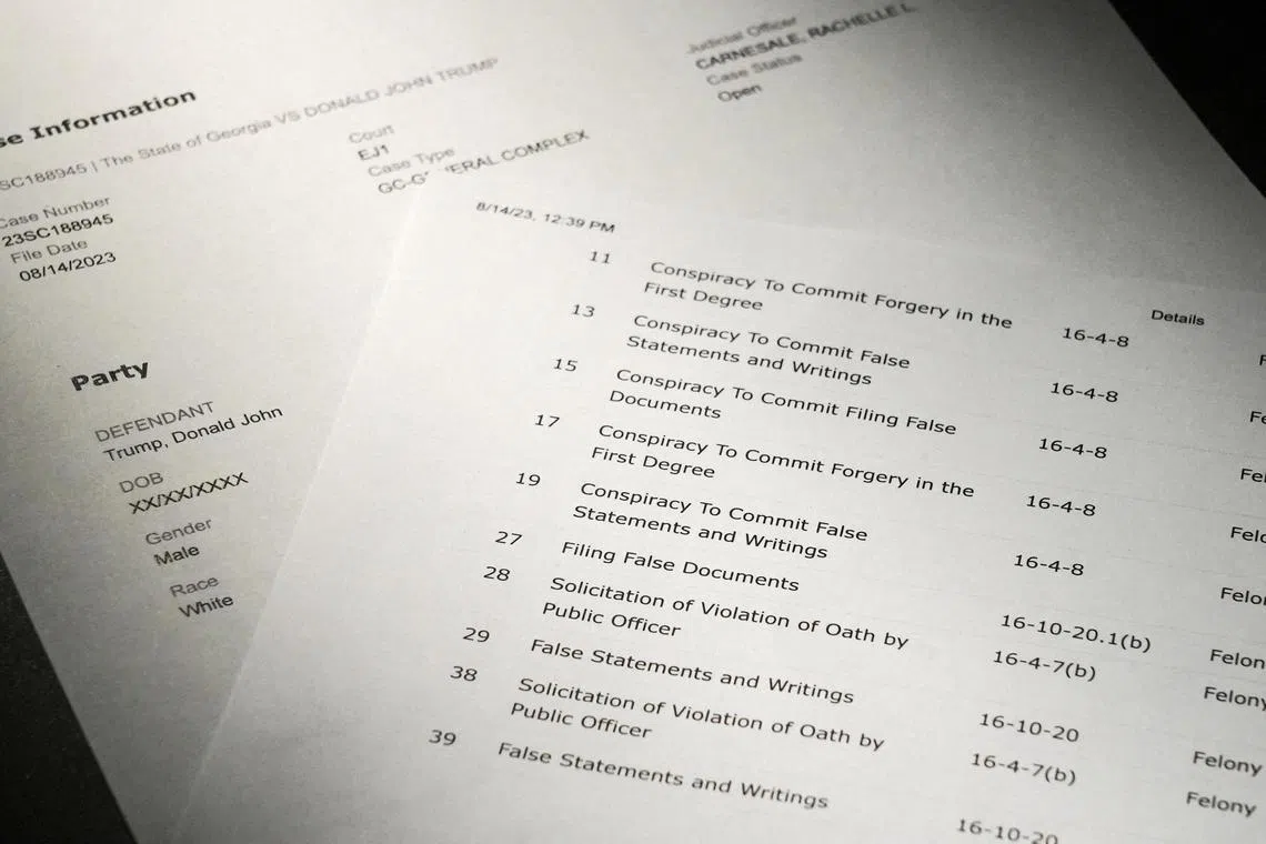 ATLANTA, Georgia – Former US president Donald Trump was indicted on Tuesday on charges of racketeering and a string of election crimes after a sprawling, two-year probe into his efforts to overturn his 2020 defeat to Mr Joe Biden in the US state of Georgia