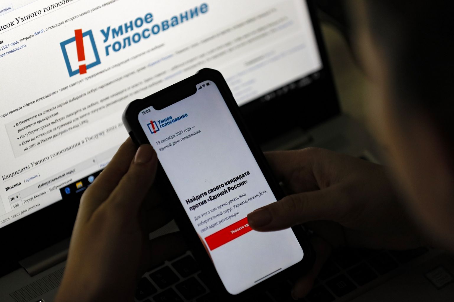 A woman examines Alexei Navalny's Smart Voting app on her cellphone in Moscow, Russia, on Sept 17, 2021.