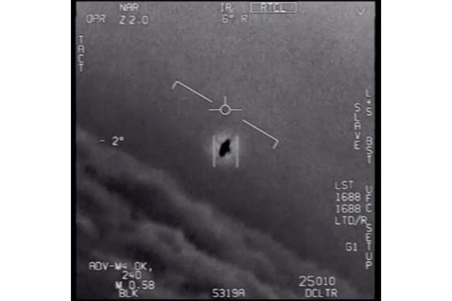 An image taken from a video released by the Defense Department's Advanced Aerospace Threat Identification Program, an encounter near San Diego between two Navy F/A-18F fighter jets and an unknown object in 2004.