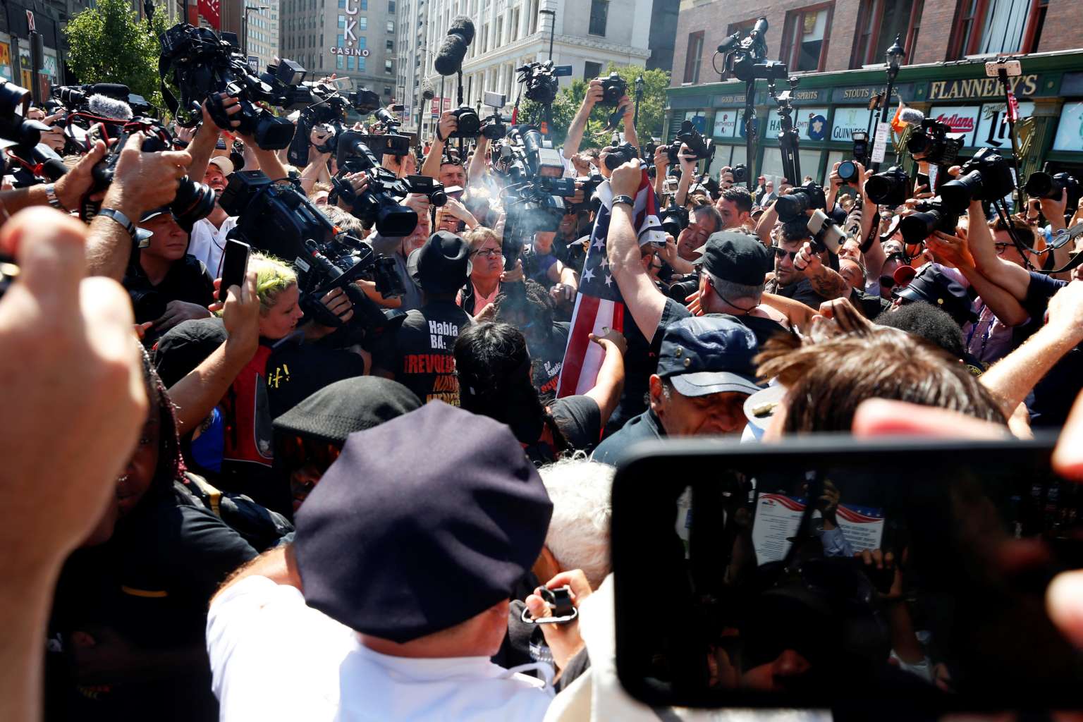 Tensions flared on the streets just one block from Quicken Loans Arena where Republicans anointed Donald Trump as their party's 2016 presidential nominee, as a man believed to have burned a flag was confronted by a counter-protester.
