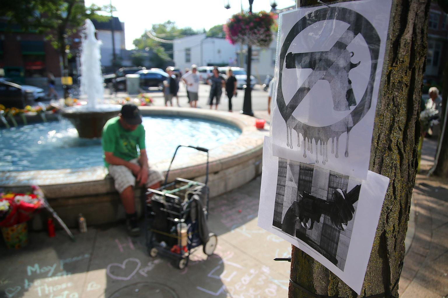 Anti-gun posters are seen attached to a tree at Alexander the Great Parkette, the scene of a mass shooting on Danforth Avenue in Toronto, Canada on July 25, 2018.
