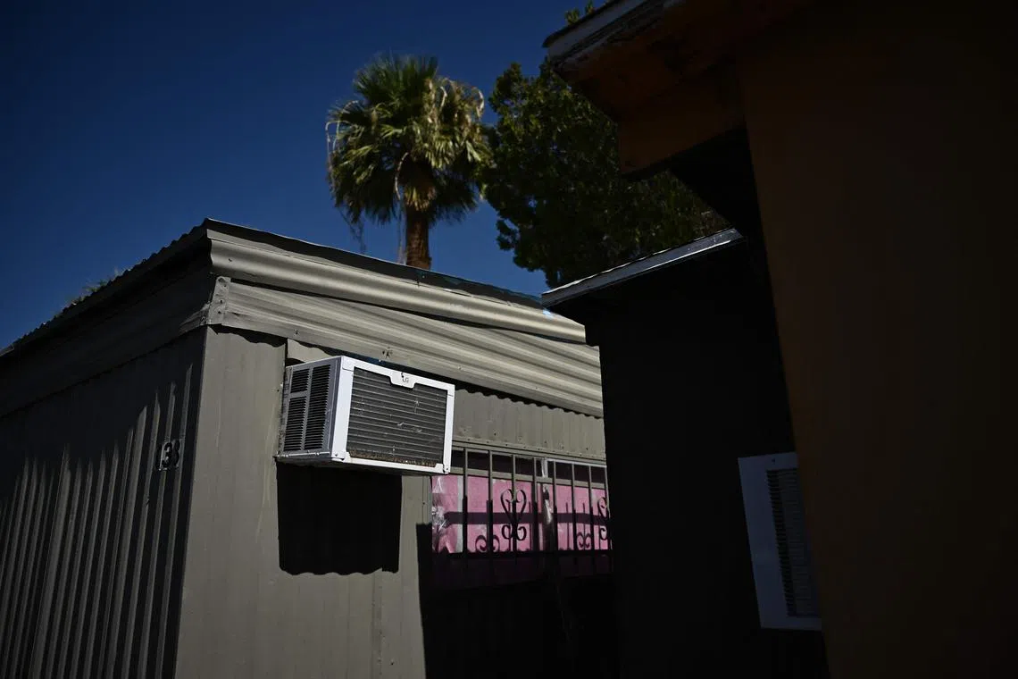 A window air-conditioning unit mounted through a wall of a mobile home in Phoenix, Arizona, on July 20.