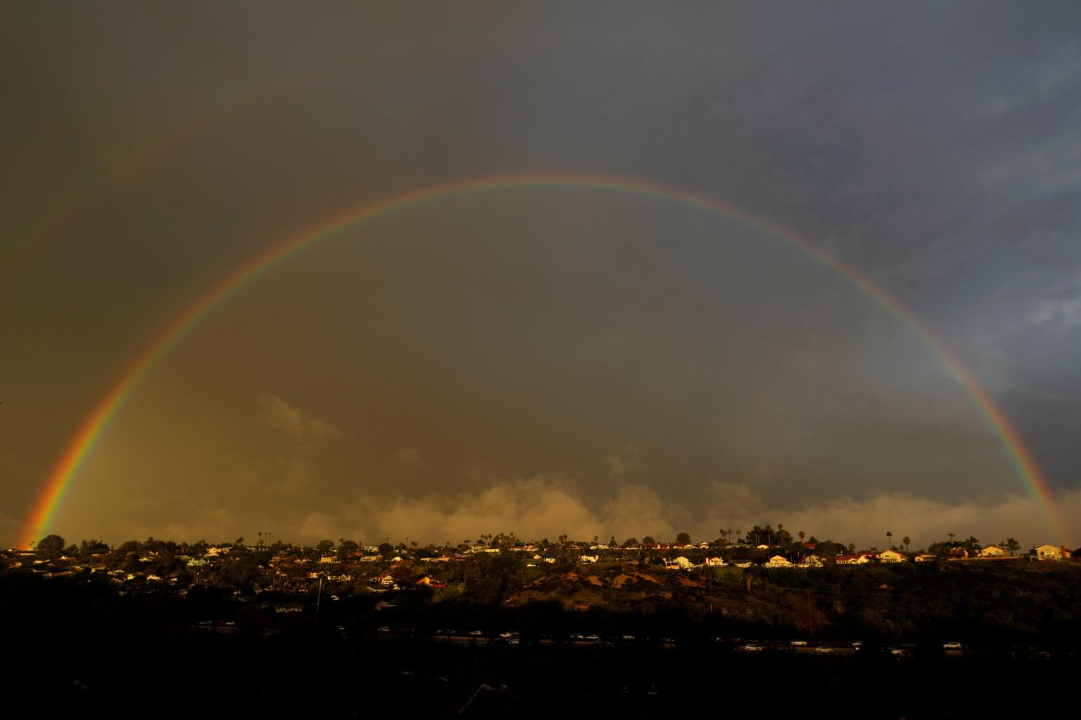 A rainbow appears above homes on a hillside following a rain storm in Encinitas, California, on Jan 31, 2019.