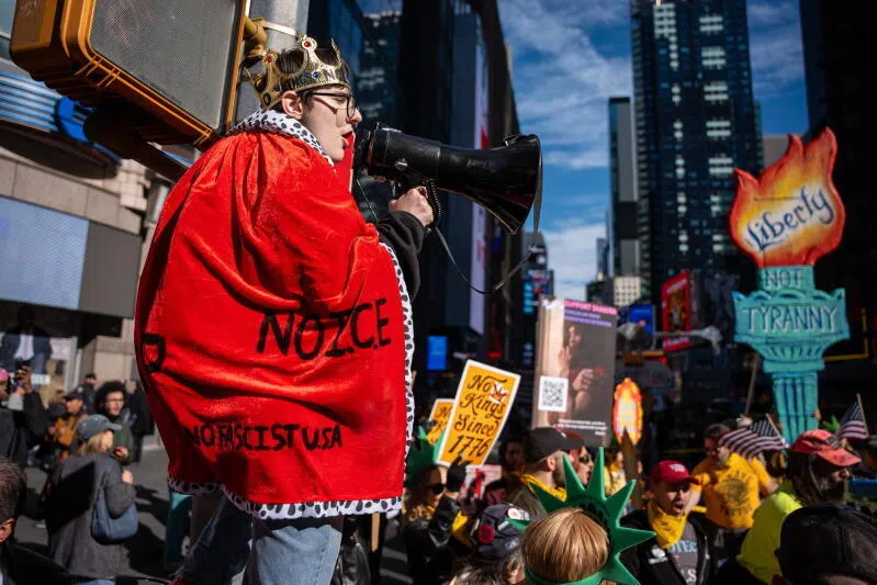 People participate in the 'No Kings' protest in New York, USA, on Oct 18.