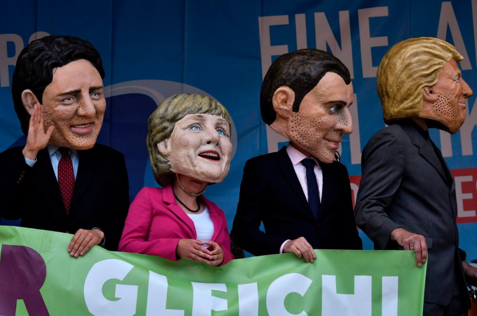 Performers wearing masks of (left to right) Prime Minister of Canada Justin Trudeau, German Chancellor Angela Merkel, French President Emmanuel Macron and US President Donald Trump during a demonstration called by several NGOs ahead of the G20 summit in Hamburg.