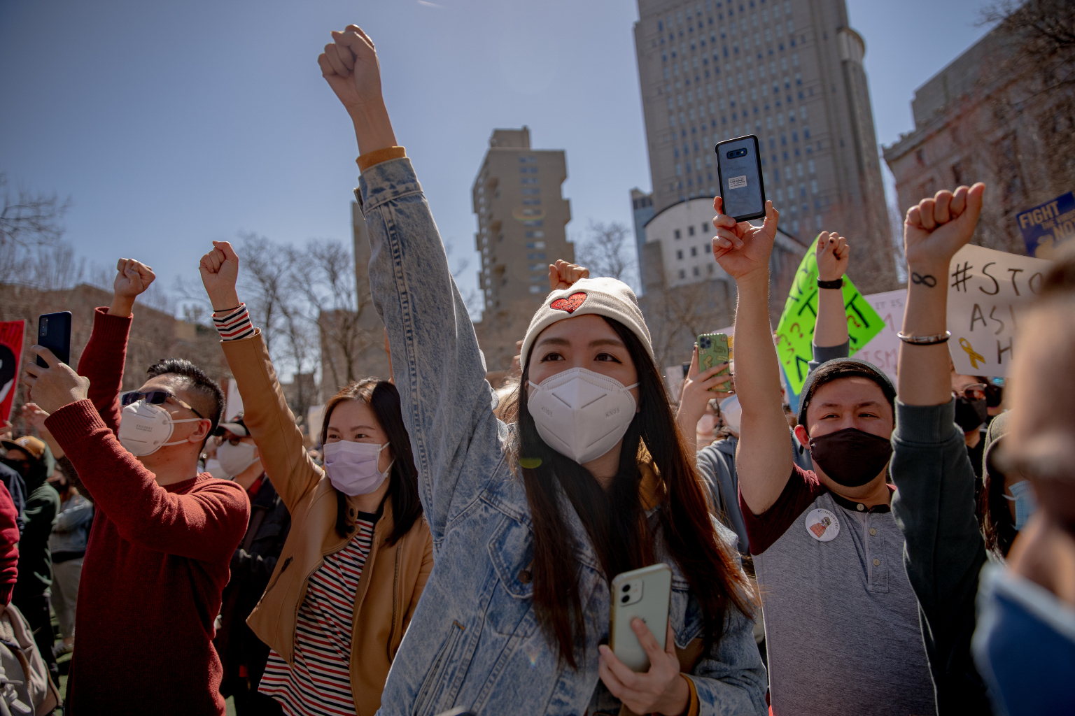 Demonstrators at an AAPI Rally Against Hate in New York on Sunday. Stop AAPI Hate is a group that tracks incidents of hate against Asian Americans and Pacific Islanders in the US.