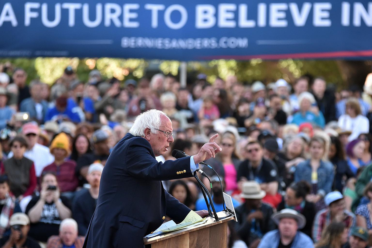 Democratic presidential candidate Bernie Sanders speaks at a rally in Oakland, California on May 30.