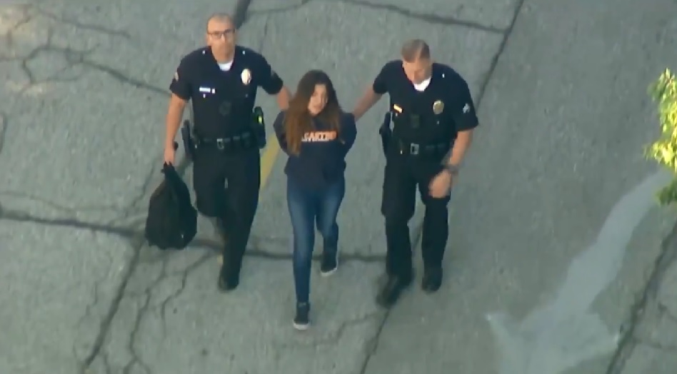 Aerial TV footage showed a handcuffed female suspect being taken into custody and placed into a patrol car while police went room to room, leading many students out with their hands behind their backs.