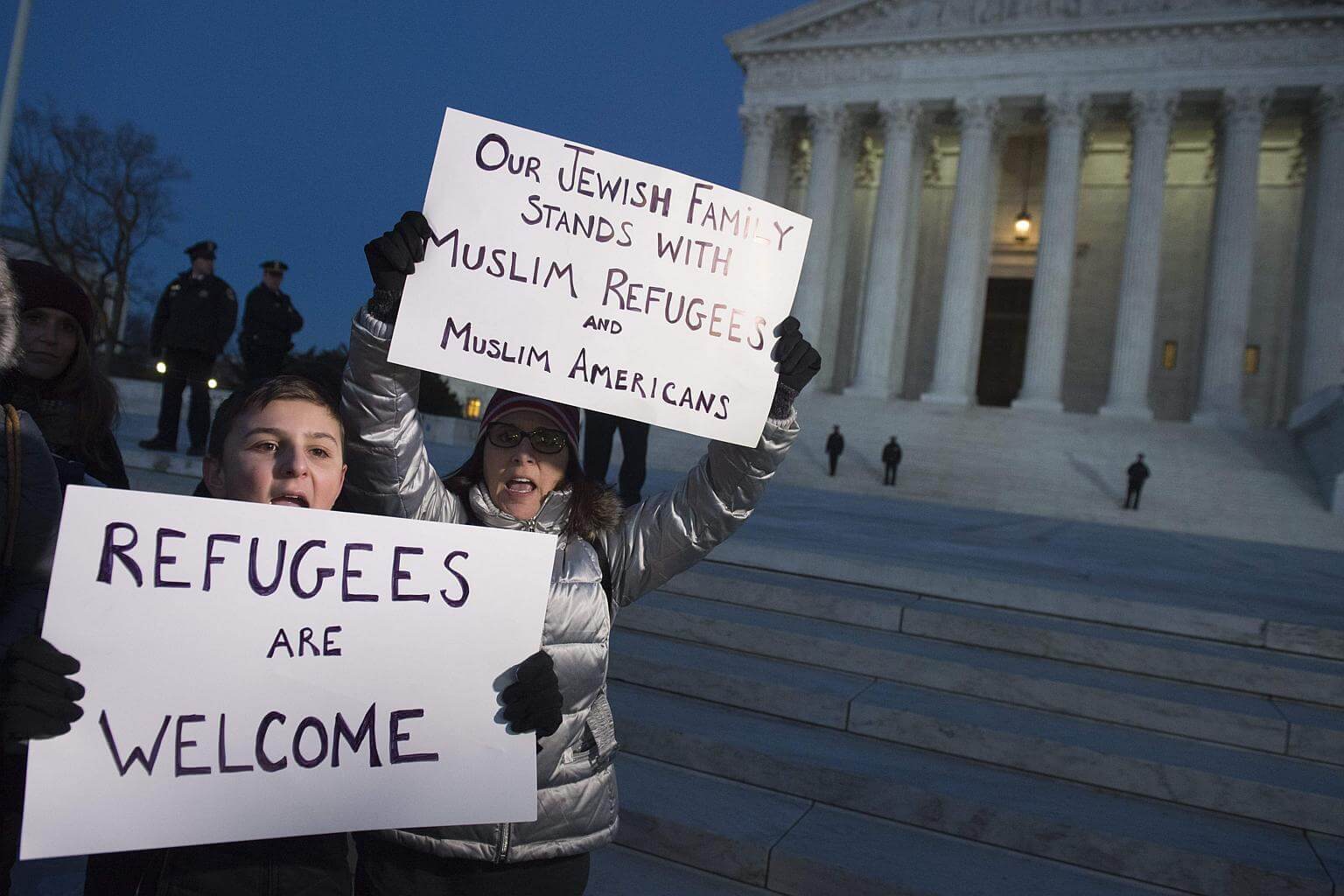 Demonstrators protest against US President Donald Trump and his administration's ban of travellers from seven countries by executive order, during a rally outside the US Supreme Court in Washington, DC.