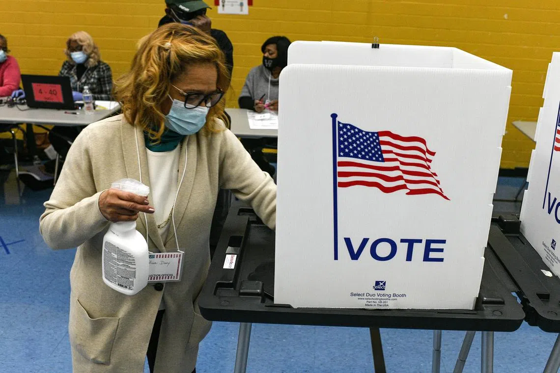 A voting official disinfects a voting booth in Lansing, Michigan, on Nov 3, 2020.