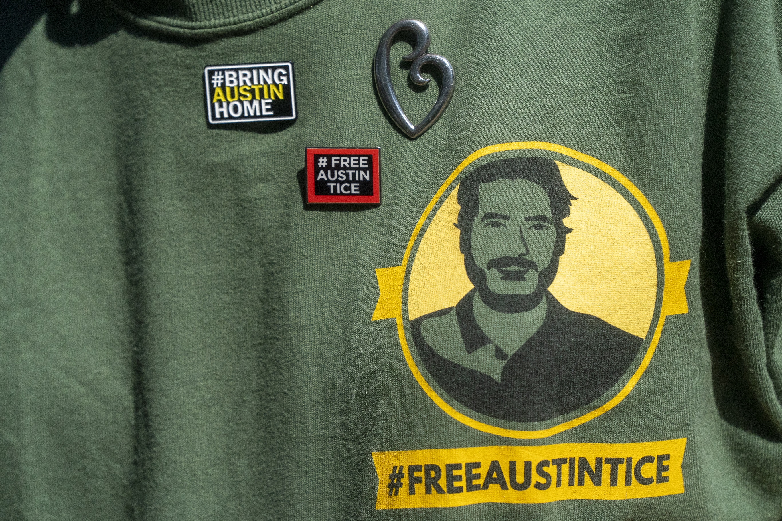 A T-shirt and pins worn by Austin Tice's mother, Debra, during a campaign event to bring him back to the US.