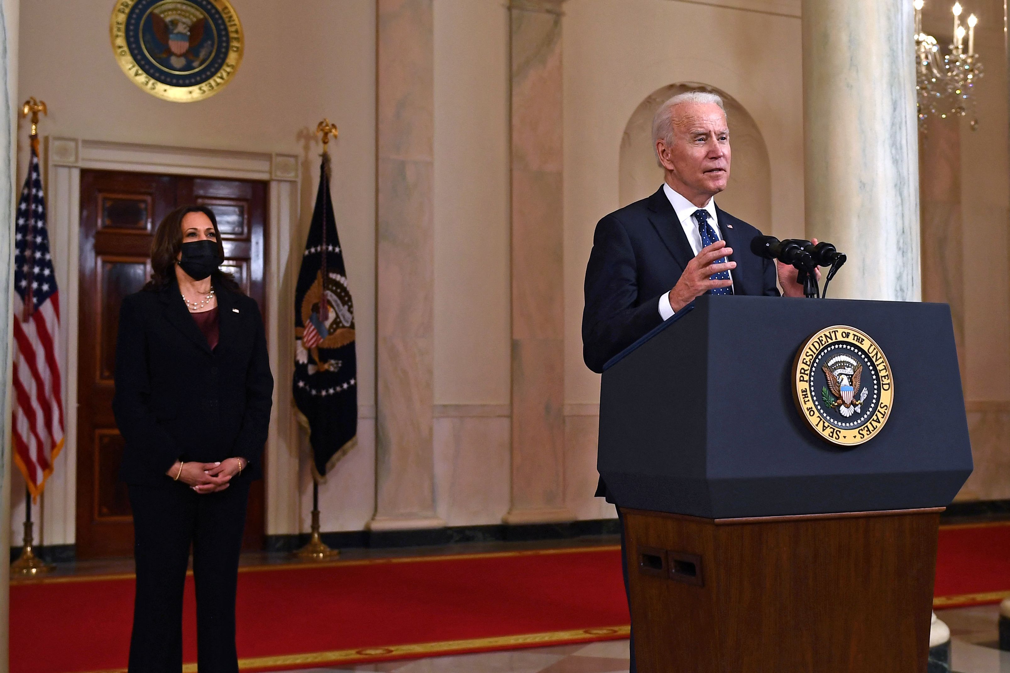 Vice-President Kamala Harris (left) listens as US President Joe Biden delivers remarks on the guilty verdict against Derek Chauvin at the White House, on April 20, 2021.
