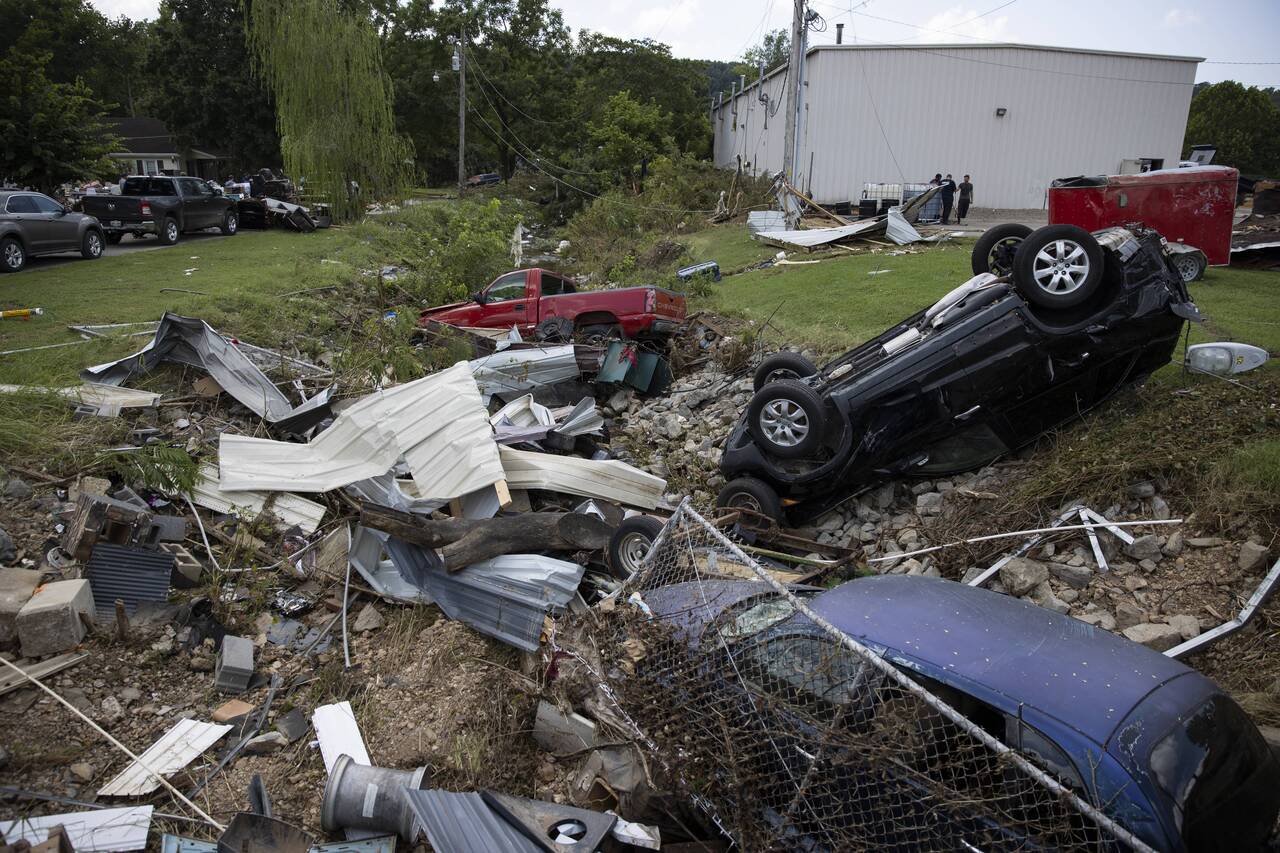 Vehicles swept away by flood waters are seen piled in a ditch in Waverly, Tennessee, on Aug 23, 2021.