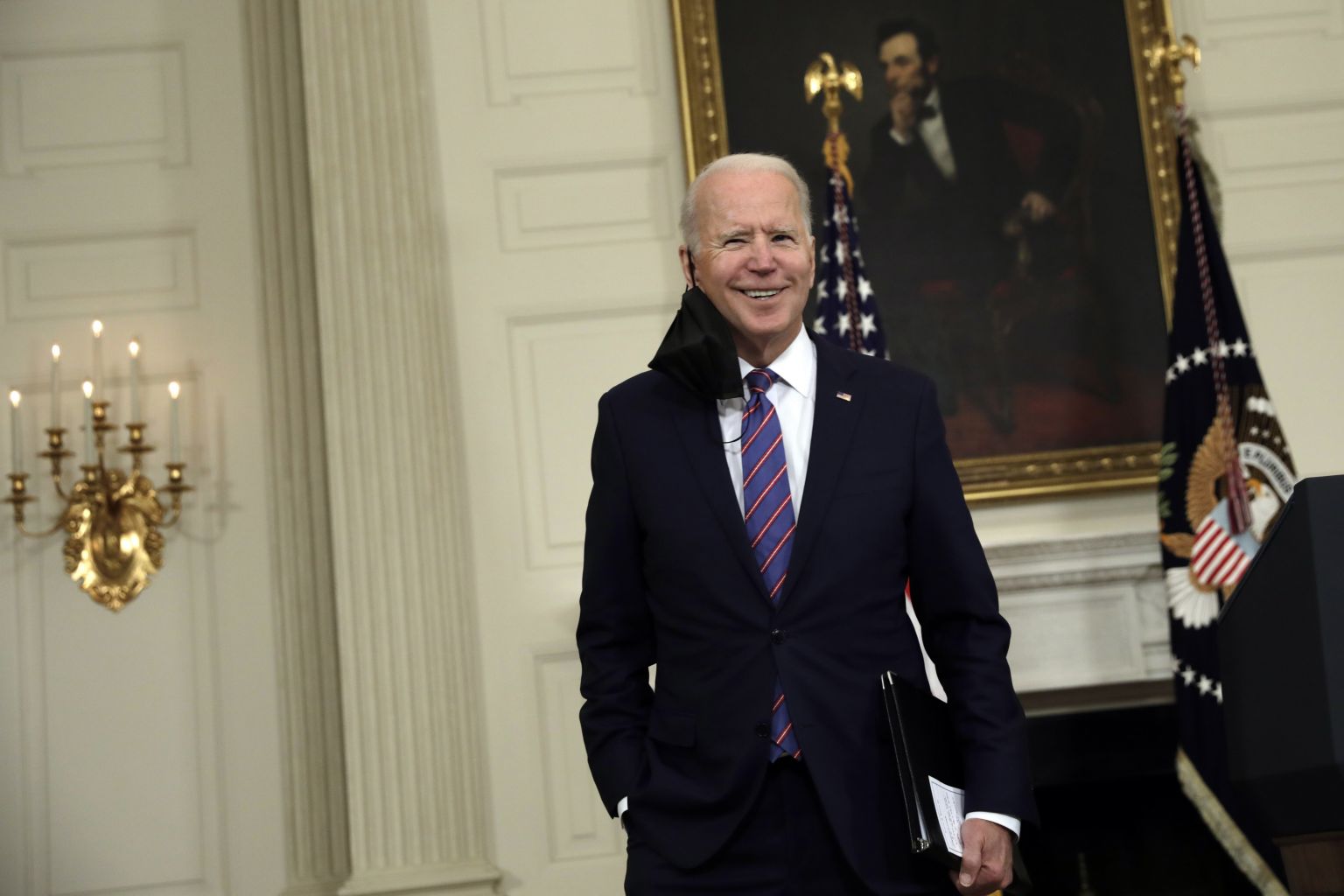 US President Joe Biden smiles after delivering remarks on the March jobs report at the White House.