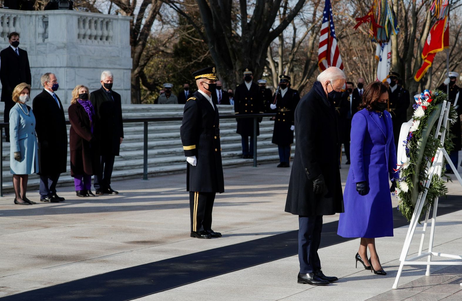 Joe Biden and Kamala Harris take part in a wreath-laying ceremony, with Bill Clinton, Hillary Clinton, George W. Bush and Laura Bush looking on.