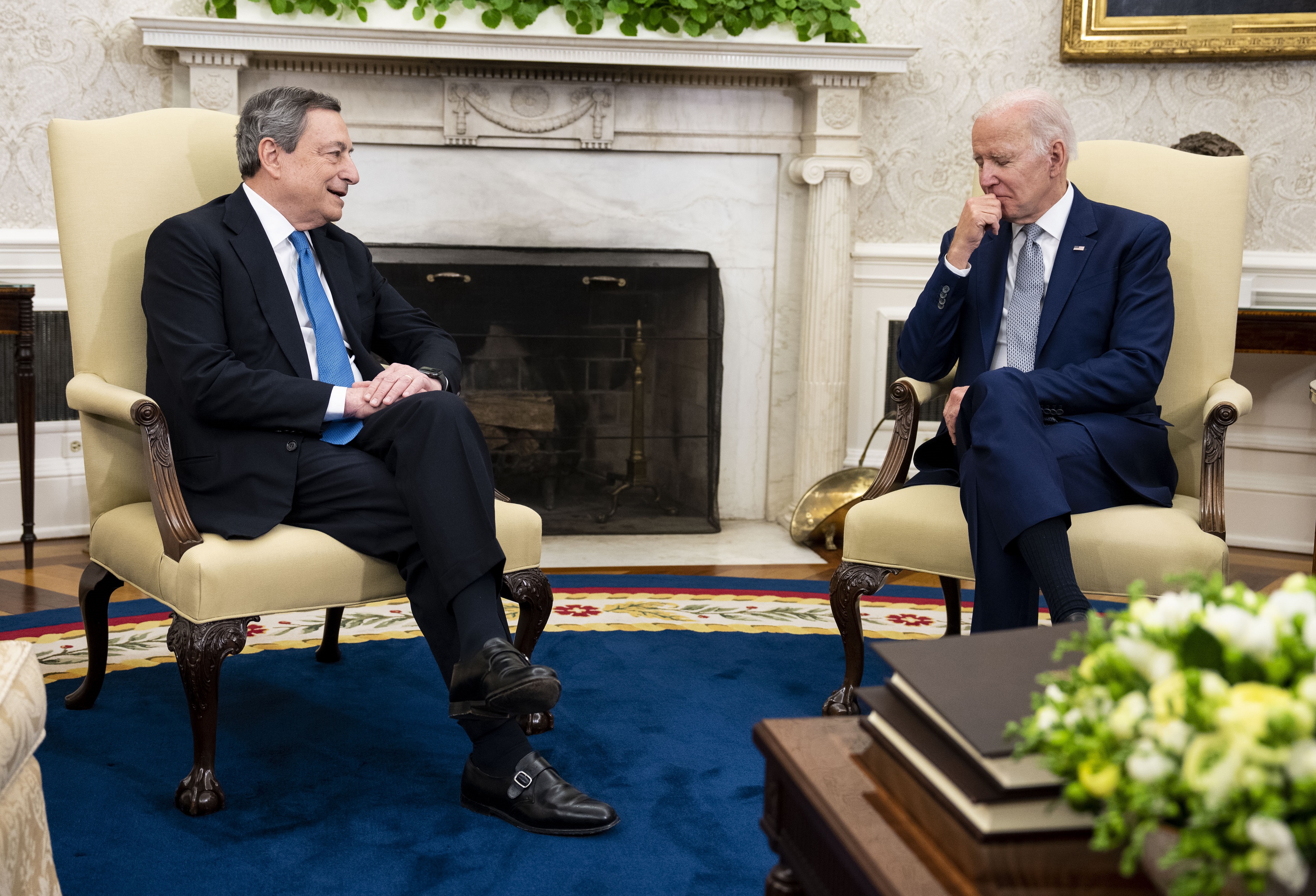 Italian Prime Minister Mario Draghi (left) talks to US President Joe Biden at the White House.