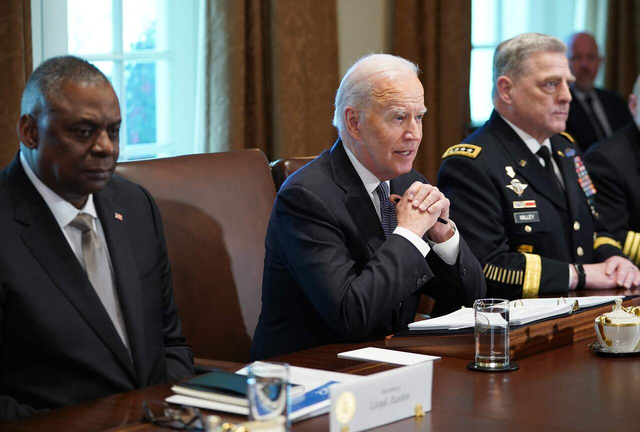 US President Joe Biden is flanked by Defence Secretary Lloyd Austin (left) and General Mark Milley as he meets with military leaders at the White House on April 20, 2022.