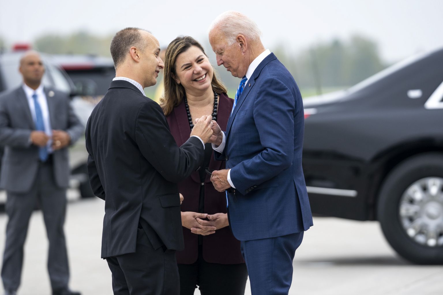 US President Joe Biden is greeted by Lansing Mayor Andy Schor and Democratic Representative Elissa Slotkin as he arrives in Michigan on Oct 5, 2021.