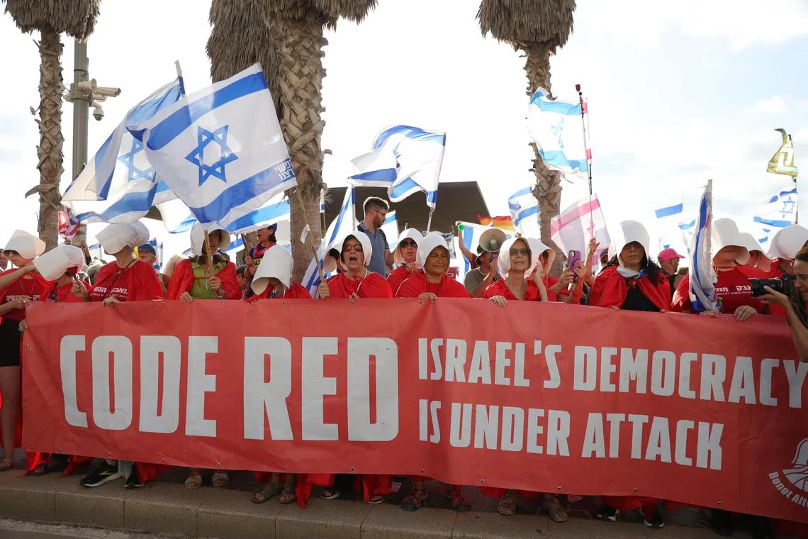 Israelis protest against the government’s justice system reforms outside the US Embassy in Tel Aviv.