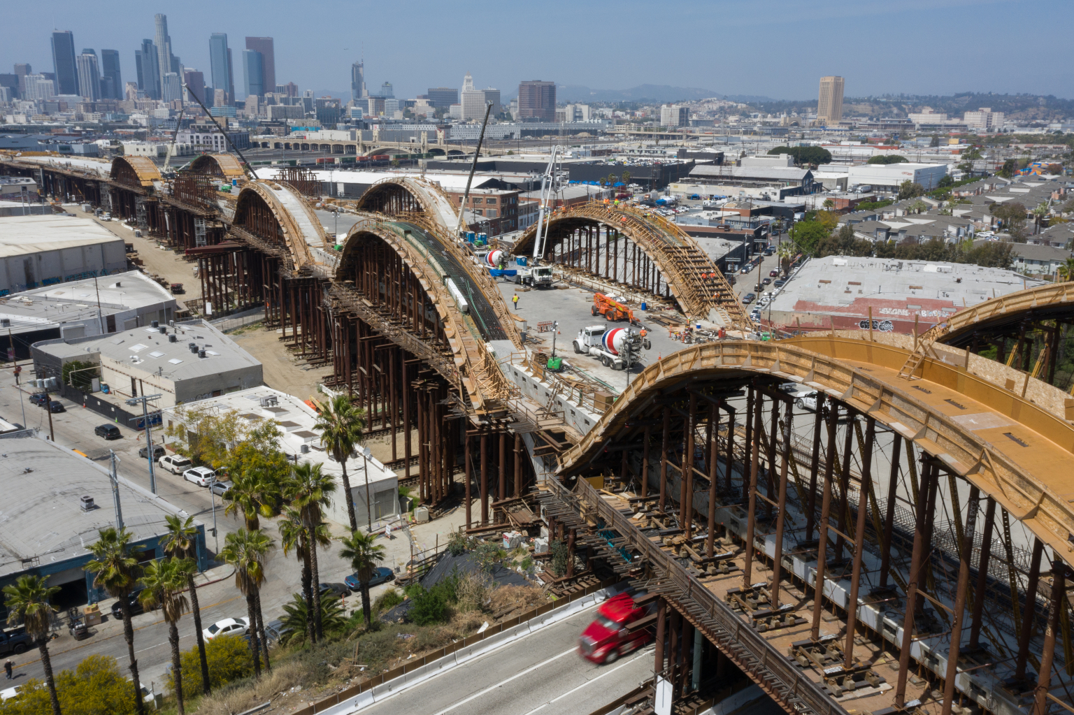 Construction on the Sixth Street Viaduct replacement project in Los Angeles, on April 6, 2021.