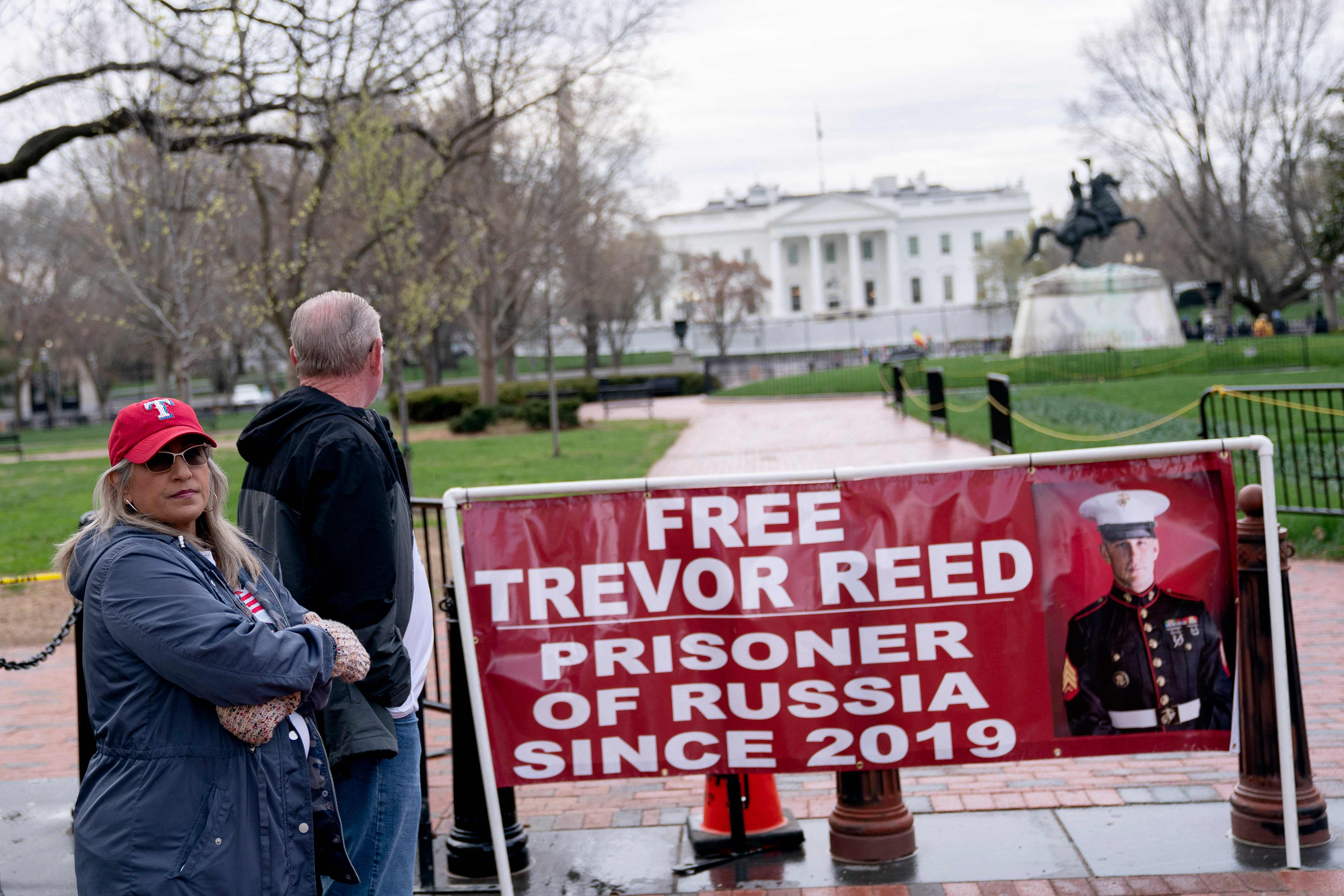 Paula and Joey Reed, parents of detained former Marine Trevor Reed, with a banner near the White House on March 30, 2022.