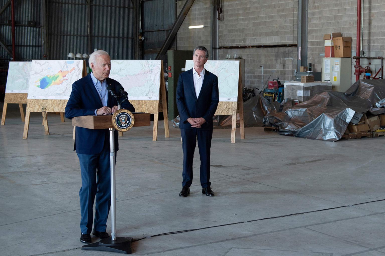 Mr Joe Biden speaks about wildfires and climate change as Mr Gavin Newsom listens at Sacramento Mather Airport on Sept 13, 2021.