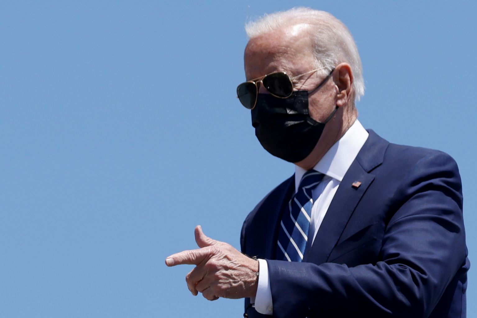 Biden gestures as he arrives aboard Air Force One in Lake Charles, Louisiana.