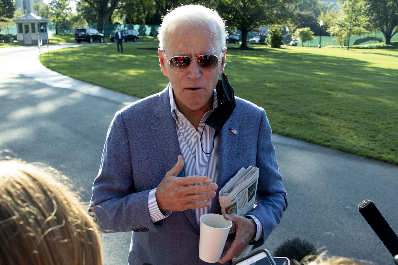 US President Joe Biden speaks to members of the media before boarding Marine One on the South Lawn of the White House, on Oct. 2, 2021.