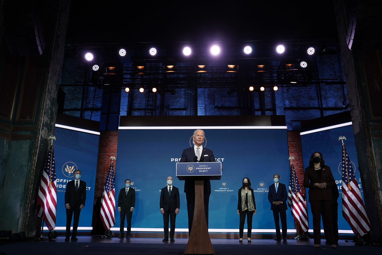 US President-elect Joe Biden speaks at The Queen Theatre in Wilmington, Delaware, on Nov 24, 2020.