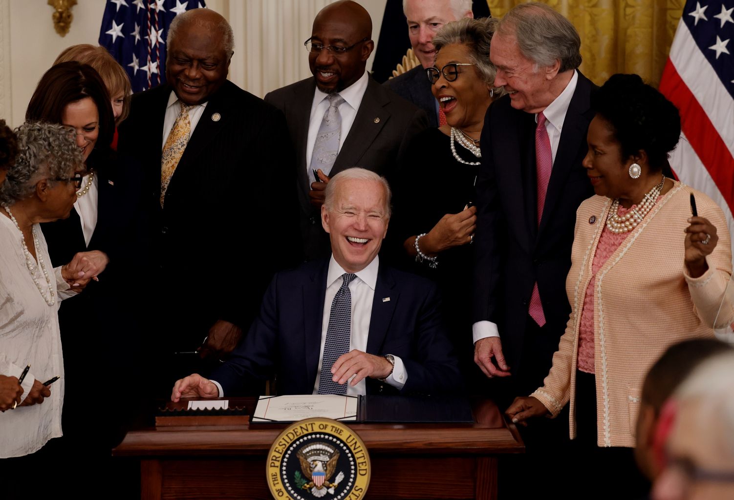 US President Joe Biden laughs with Vice-President Kamala Harris and members of Congress as he signs the Juneteenth National Independence Day Act into law.