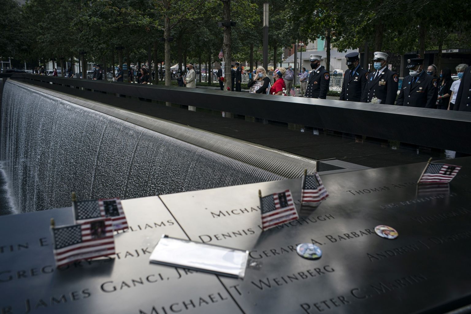 People stand at the 9/11 Memorial in New York, on Sept 11, 2020, the 19th anniversary of the Sept 11 terrorist attacks.