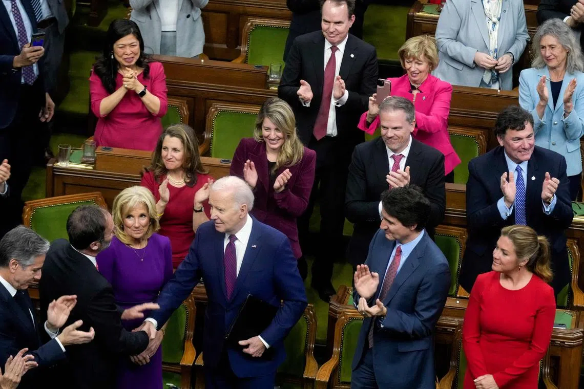 US President Joe Biden, accompanied by First Lady Jill Biden, arriving at the Canadian Parliament in Ottawa, where Mr Biden and Canadian President Justin Trudeau (second from right) addressed Parliament, on March 24.