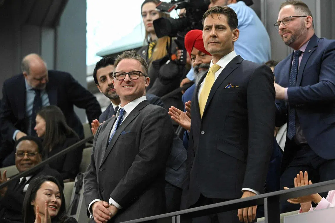Canadians Michael Spavor (left) and Michael Kovrig in Canada’s House of Commons on March 24, during the speeches given by US President Joe Biden and Canadian President Justin Trudeau on Parliament Hill in Ottawa.