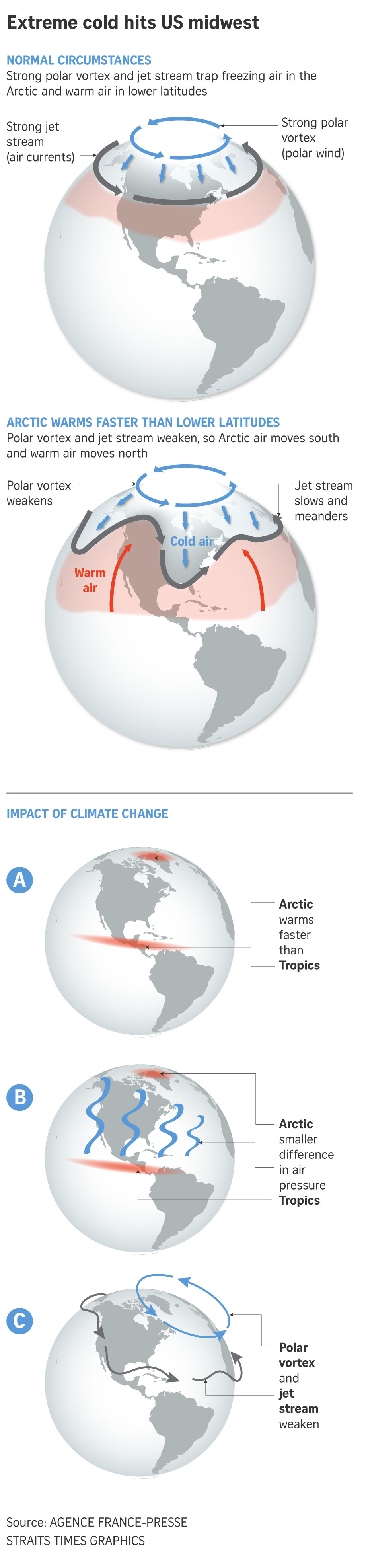 CHICAGO (REUTERS) - Meteorologists have blamed a phenomenon called the polar vortex for the bitter cold that has descended on much of the central and eastern United States this week, forcing residents to huddle indoors, closing schools and businesses, and cancelling flights.