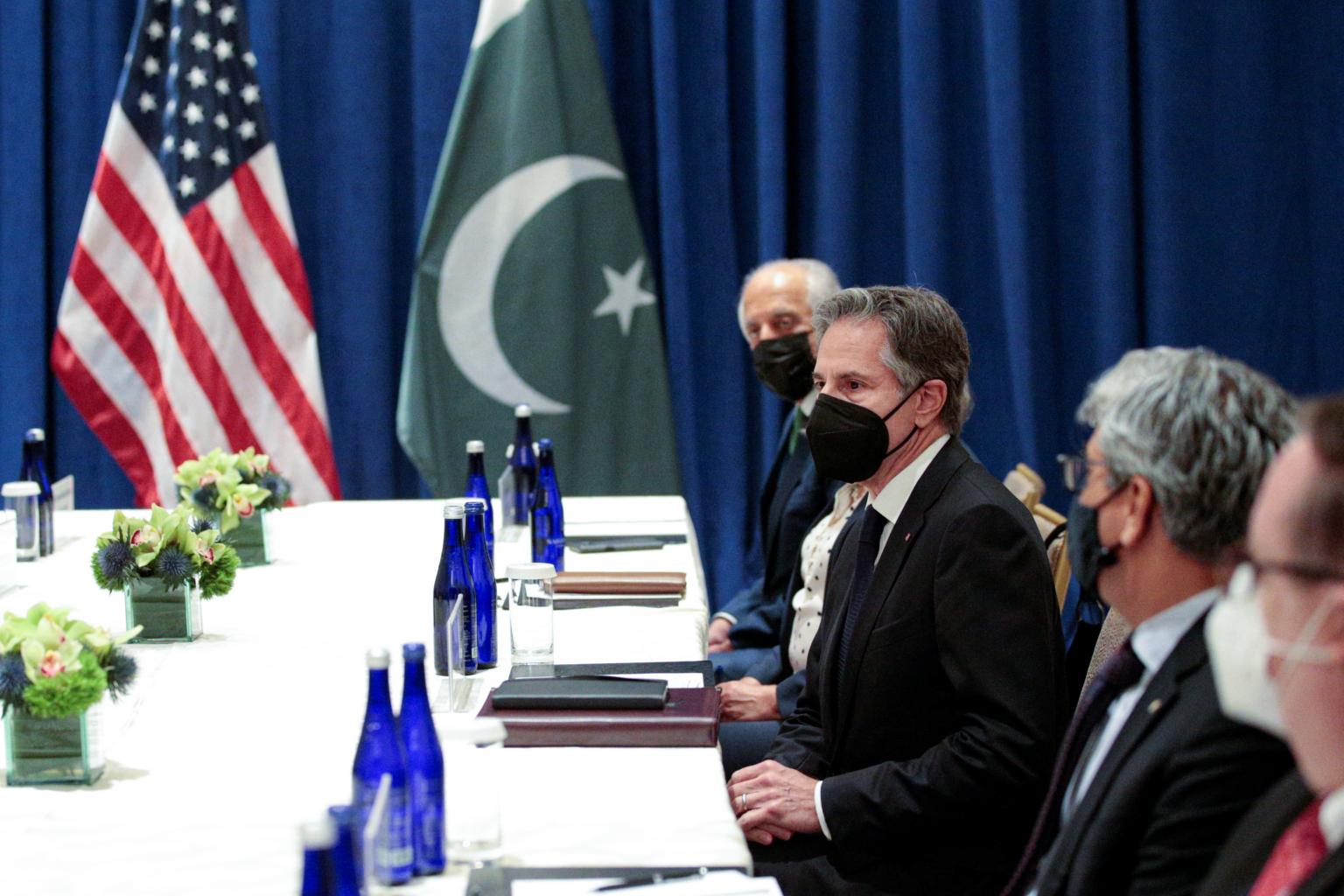 Mr Antony Blinken (centre) meets with his Pakistani counterpart (not pictured) on the sidelines of the 76th Session of the U.N. General Assembly in New York, on Sept 23, 2021.